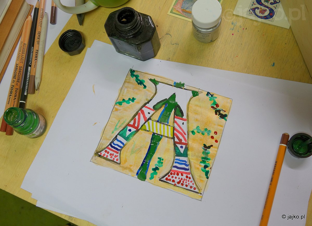 Na ostatnich w tym roku zajęciach grupy rysunkowo malarskiej nie było lekko. Jak średniowieczni iluminatorzy, stalówką i pędzelkiem z kuny, żmudnie i starannie budowaliśmy skomplikowane kompozycje inicjałowe.