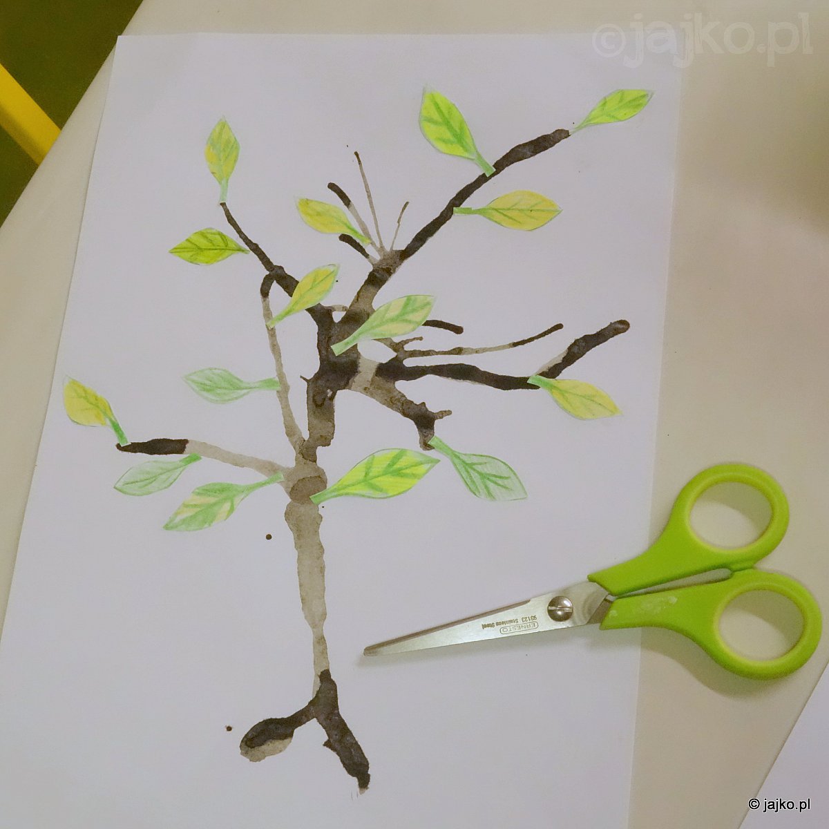 Na przekór paskudnej pogodzie postanowiliśmy na zajęciach przywołać wiosnę. Wykonane metodą kleksograficzną nagie pnie drzew zapełniliśmy świeżą zielenią liści.