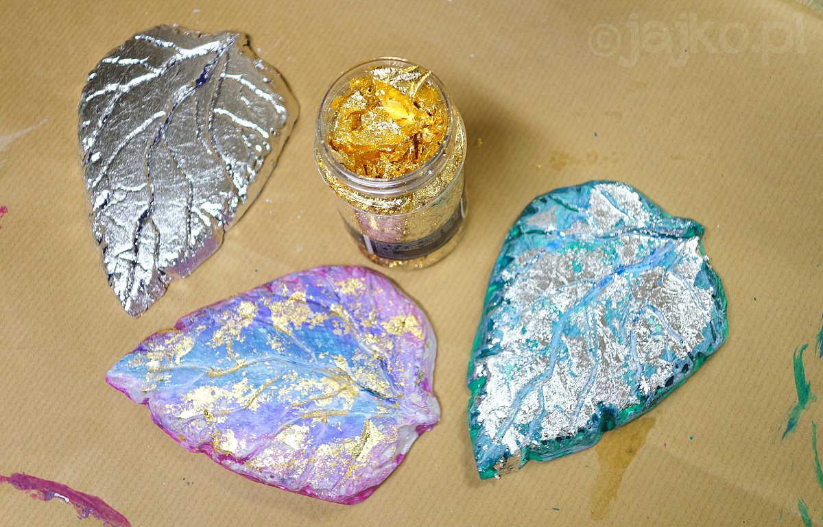 Szlachetną sztukę pozłotnictwa ćwiczyliśmy pokrywając pomalowane odlewy delikatnymi płatkami szlagmetalu. Gipsowe liście rozbłysły złotem, srebrem i miedzią.
