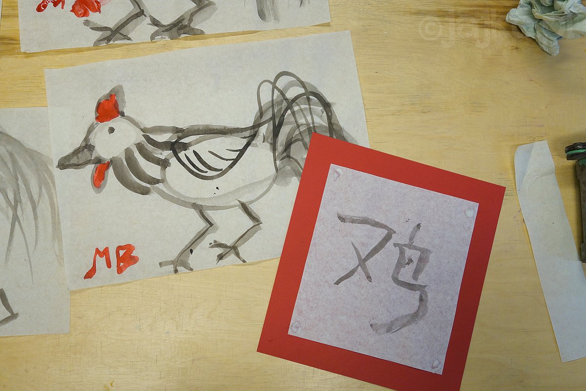 Rozpoczynający się Rok Koguta uczciliśmy pracami wykonanymi chińskim tuszem na bibule i tradycyjnymi wycinankami podwójnego szczęścia.