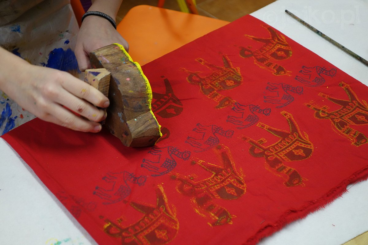 Tkaniny potraktowane drewnianymi indyjskimi stemplami zamieniły się we wzorzyste kupony materiału pełne kolorowych zwierząt. Po przeszyciu na maszynie i ozdobieniu chwostami stały się niepowtarzalnymi poduszkami.