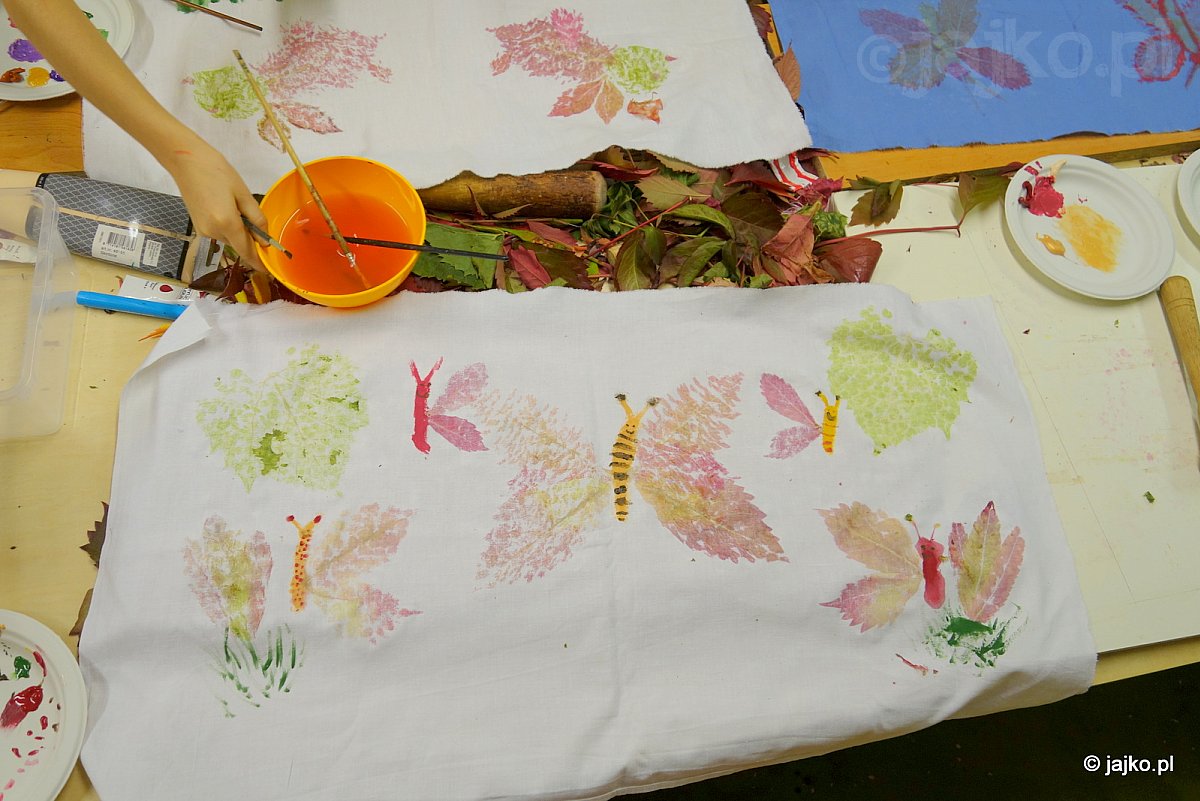 W ubiegłym tygodniu dzięki japońskiej technice hapa zome udało się przedłużyć piękno jesiennych liści. Utrwalaliśmy kompozycje z nich na tkaninach wykorzystując zawarte w nich naturalne barwniki. Kolorowe liście przybrały kształty stworków, dinozaurów, gwiazd, motyli i barwnych bukietów. Były też grzyby, ryby i krasnoludki. Niektóre prace uzupełnione zostały detalami w technice akrylowej.