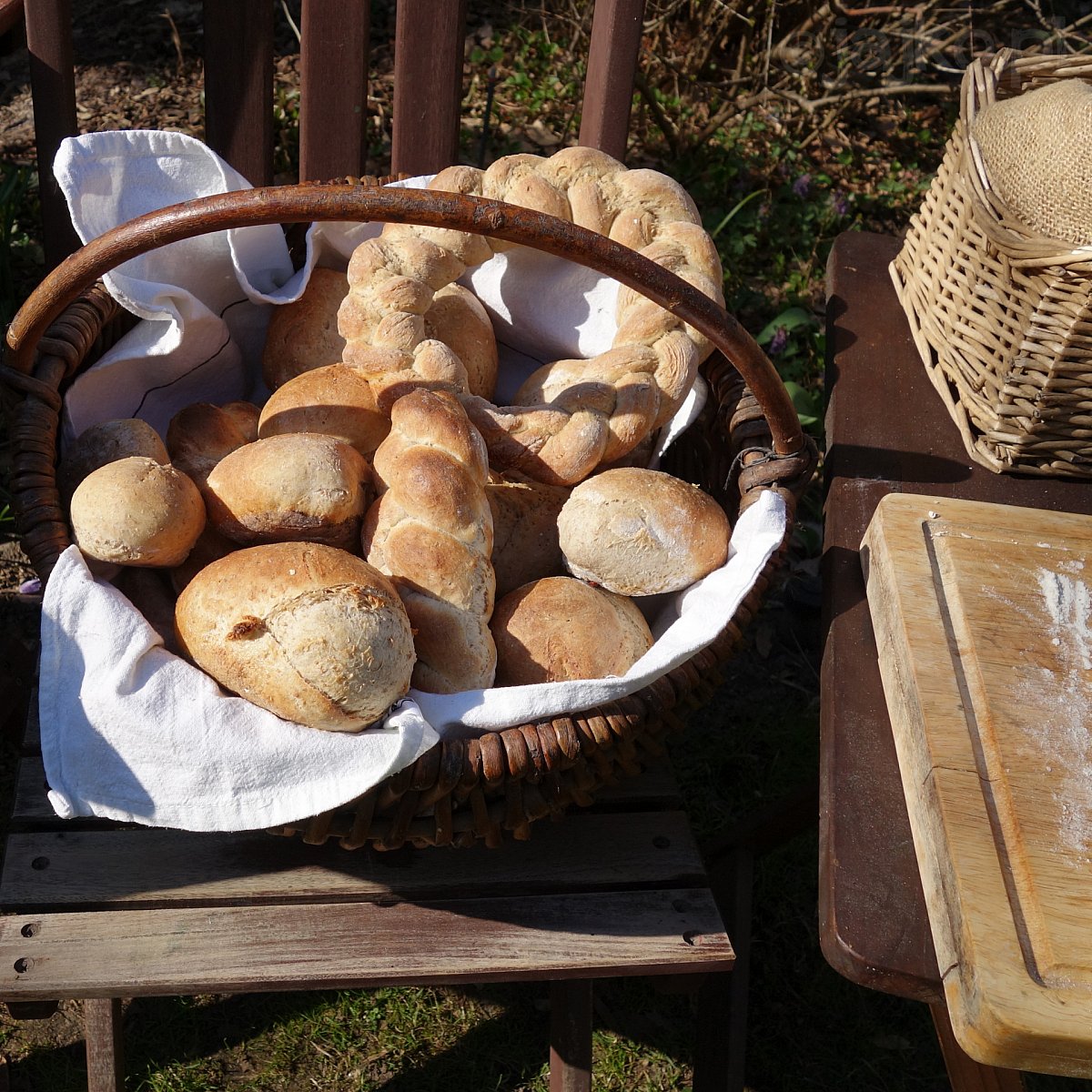 W piękny pierwszokwietniowy dzień Jajko w koprodukcji z WCK filia Aleksandrów poprowadziło warsztaty wypieku chleba. Z połączenia "Mąki Pszennej Sokołowskiej" i "Podlaskiego Tygla zbóź" (vivat młyn braci Górskich w Repkach!), po długotrwałym mieszaniu i zagniataniu powstały sprężyste kule. Gdy ciasto chlebowe rosło, w glinianym piecu upiekliśmy pyszne gryczotto i pizze, a posileni ukręciliśmy z wikliny wielkanocne wieńce. Na koniec uformowane i wyrośnięte chlebki, bułeczki, warkocze, ślimaki, kołacze wylądowaly w piecu w którym błyskawicznie zyskały rumianą skórkę.