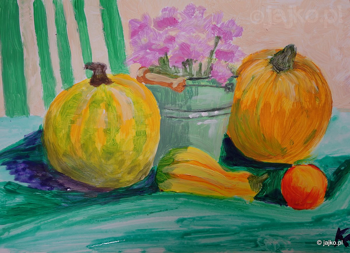Ostatnie dwa tygodnie to jeden wielki hymn na cześć dyni. Okazala się wdzięcznym tworzywem plastycznym - układaliśmy kompozycje florystyczne w dyniach, malowaliśmy dynie z ceramiki i lampiony z dyniami, rysowaliśmy dynie kredkami i suchymi pastelami oraz malowaliśmy martwe natury z dyniami w roli głównej.