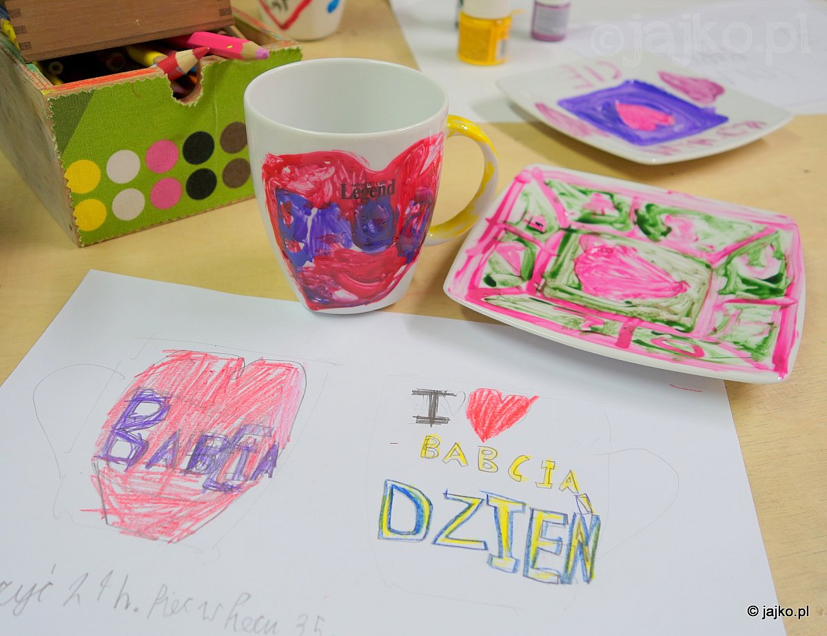 Na obchody dzisiejszego Dnia Dziadków dziesiątki sztuk białej zastawy stołowej zyskało nową, kolorową oprawę. Naniesione farbami do ceramiki wzory utrwalone zostały poprzez wypalanie w piekarniku i zostaną wręczone jako piękne i użyteczne prezenty od kochających wnuków.