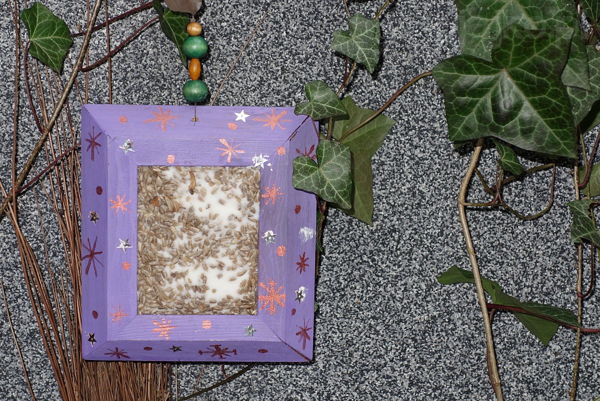 W tym roku przygotowaliśmy prezenty także dla ptaków. Drewniane ramki pomalowaliśmy farbami akrylowymi i wypałniliśmy masą ze smalcu i ziaren. Na wierzchu dekoracja z orzeszków ziemnych, przez otwór w ramce przewlekamy sznur ozdobiony koralami i wieszamy w ogrodzie. W te Święta nasi pierzaści przyjaciele mogą się pożywić w stylowym karmniku.