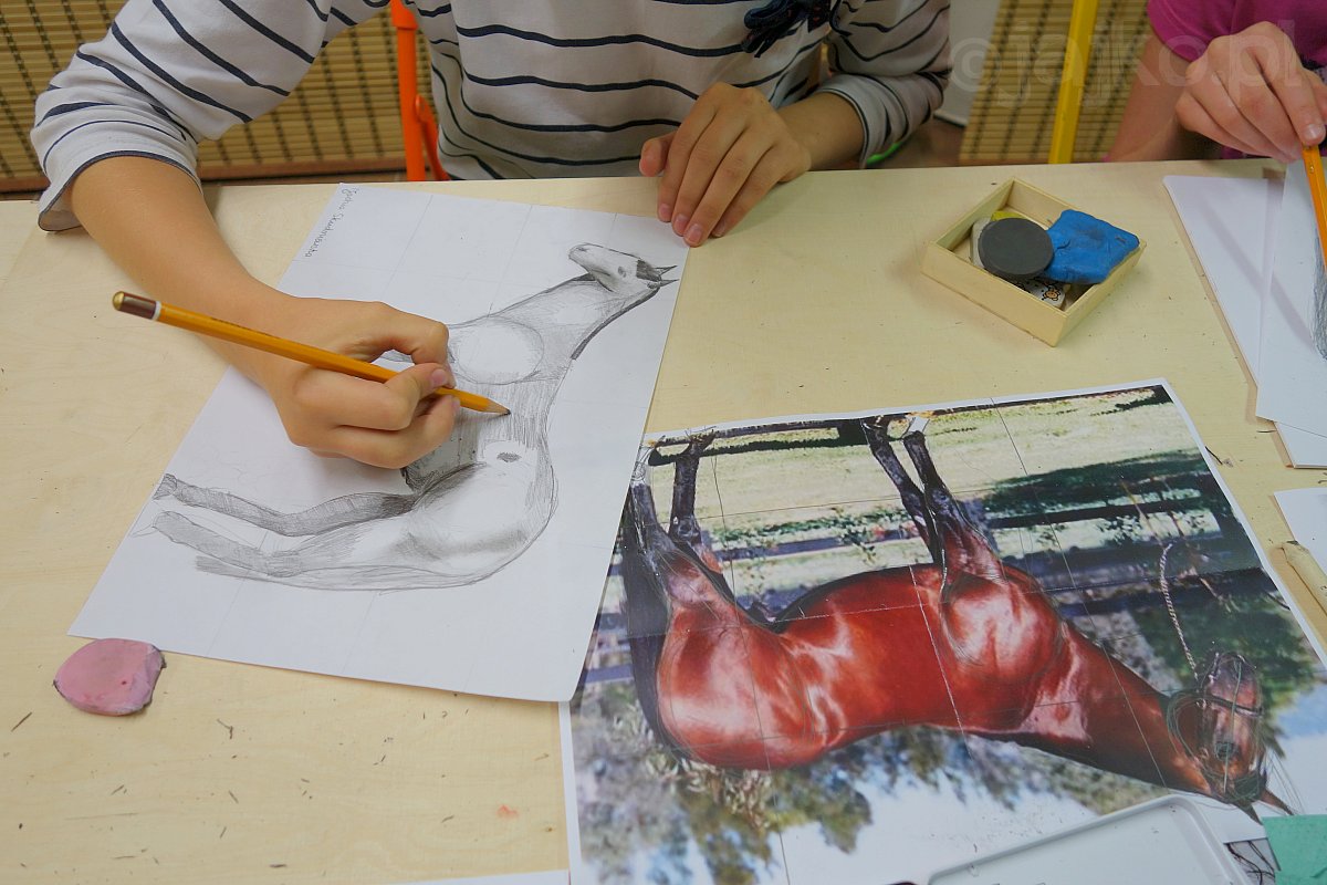 Nawet tak trudne zadanie jakim jest rysowanie koni staje się proste po znalezieniu właściwej metody. W piątek na zajęciach z rysunku dziewczyny poznały budowę konia i opanowały technikę rysunku na siatce. To pomogło im szybko opanować proporcje i skupić się na kładzeniu światłocienia.