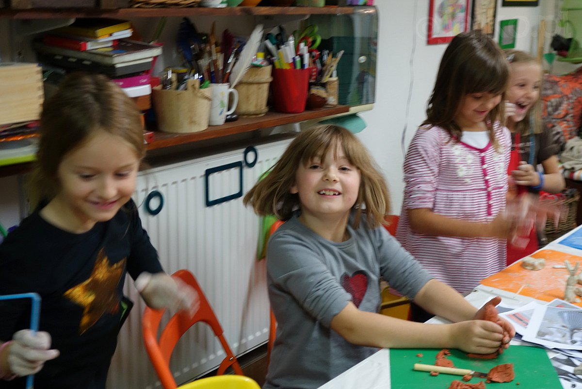 Starsze dzieci z grup I i II w tym tygodniu również zmierzyły się z gliną. Powstały między innymi dwubarwne miseczki z różnych kolorów gliny uformowane jedną z najstarszych garncarskich technik - metodą wałeczkową, powstałą jeszcze przed wprowadzeniem koła garncarskiego. Poza nimi stoły zapełniły stada urokliwych zwierzątek wśród których wyraźny prym wodzą leżące koty, wykazujące niemałe podobieństwo do słynnej figurki zaprojektowanej przez Mieczysława Naruszewicza w 1958 roku.