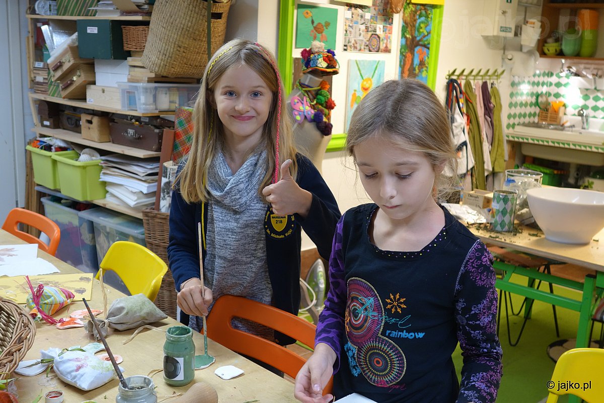 Na warsztat wzięliśmy tym razem liście - zarówno te zielone odchodzącego lata, jak i kolorowe nadchodzącej jesieni. Wykorzystaliśmy je na wszystkie dostępne sposoby: malowaliśmy je na papierze, lepiliśmy wisiorki, odciskaliśmy w plakietkach z masy plastycznej, wyciskaliśmy na tkaninach metodą hapa zome, ukladaliśmy kompozycje z ususzonych a suszonymi liśćmi ziól napełniliśmy pachnące woreczki.