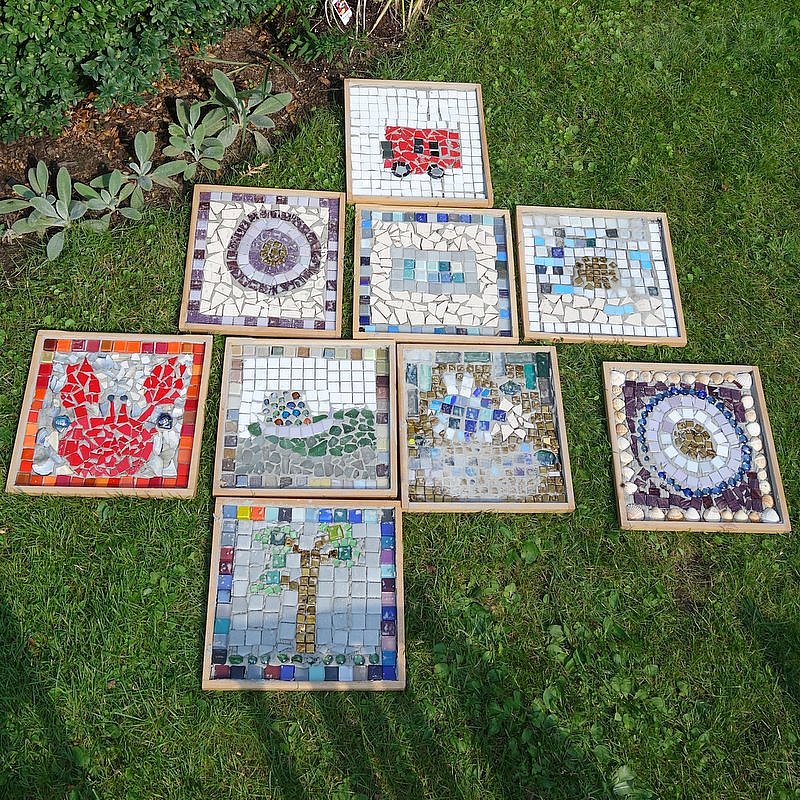 Plener poświęcony mozaice już za nami. Układanie obrazów z kolorowych elementów było świetne, ale równie pasjonujące okazało się rozłupywanie płytek na mniejsze elementy i zabawa klejem glazurniczym. Prace jeszcze schną i czekają na wykończenie fugą, ale już widać że są świetne.