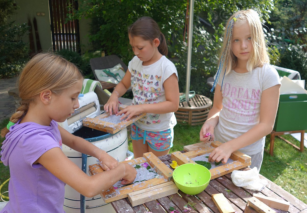 Ostatni letni plener już za nami. Tym razem zabytkowa pralka Frania wymieszała nam masę na papier czerpany. Eksperymentowaliśmi z zatapianiem w nim kwiatów i barwieniem masy papierowej. Część arkuszy stała się okładkami notesików i pamiętników. W czasie gdy papier sechł w słońcu, ćwiczyliśmy pisanie gęsimi piórami i rozmaitymi stalówkami, a także splatanie ozdobnych sznurów i chwościków do związywania kartek.