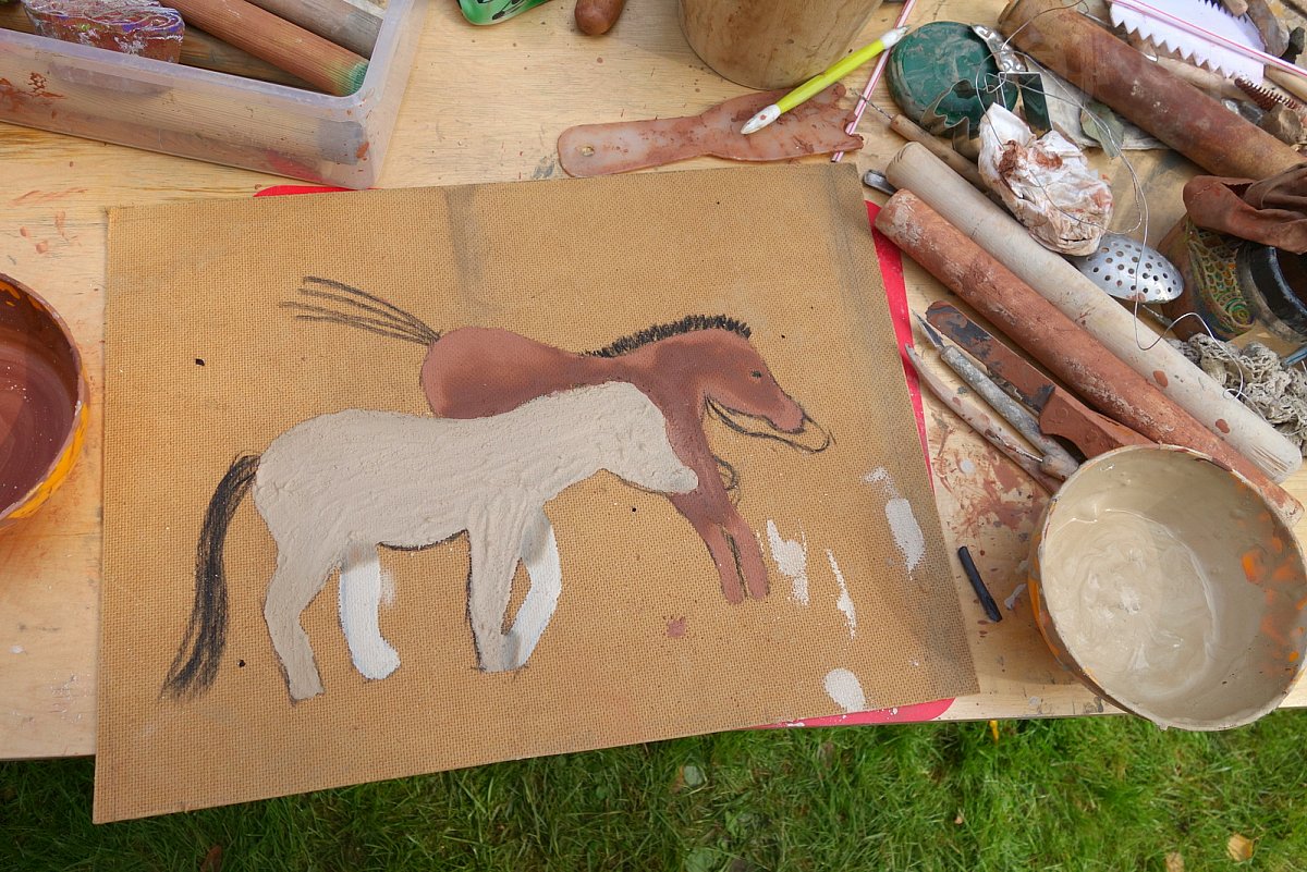 W pierwszym dniu plenerów tworzyliśmy z glin w kilku odcieniach. Wykorzystaliśmy je zarówno jako tworzywo do form przestrzennych, jak i, zainspirowani sztuką prehistoryczną, jako farbę do prac czysto malarskich.