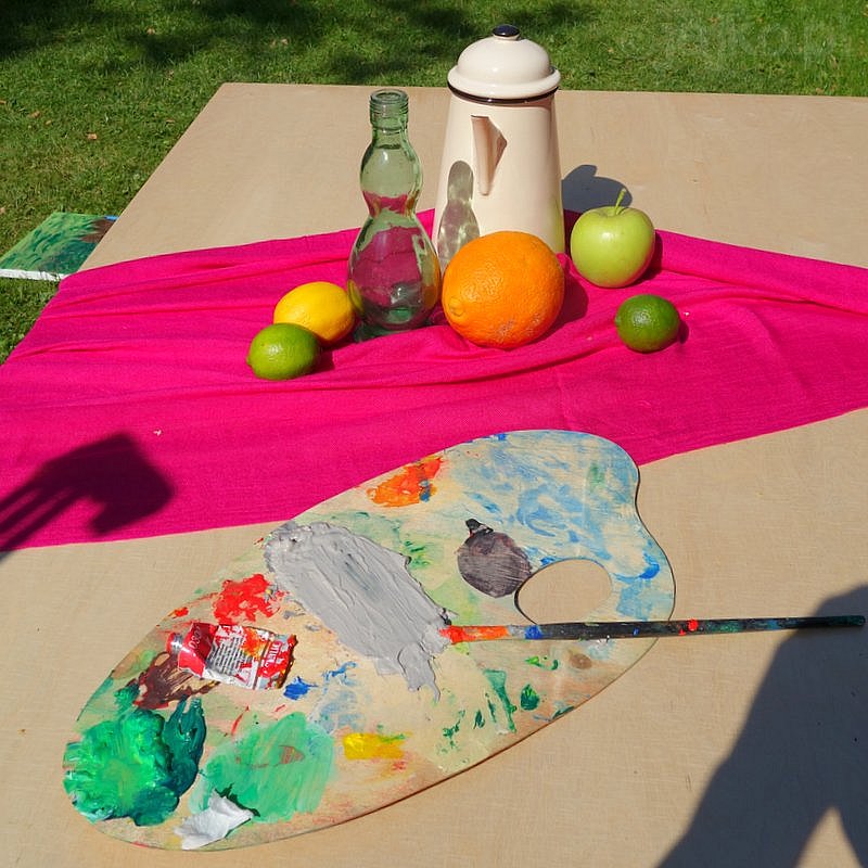 Plener przebiegł bardzo aktywnie. W pierwszej części na rozstawionych w ogrodzie sztalugach powstały klasyczne martwe natury z dzbankiem i owocami wykonane techniką tempery. W czasie przerwy obiadowej upiekliśmy wspólnie równie dekoracyjne i do tego wyśmienite pizze. Na koniec w ramach tematu dowolnego na płótnach pojawiły się motyle, pieski, magiczne drzewa i pejzaże.