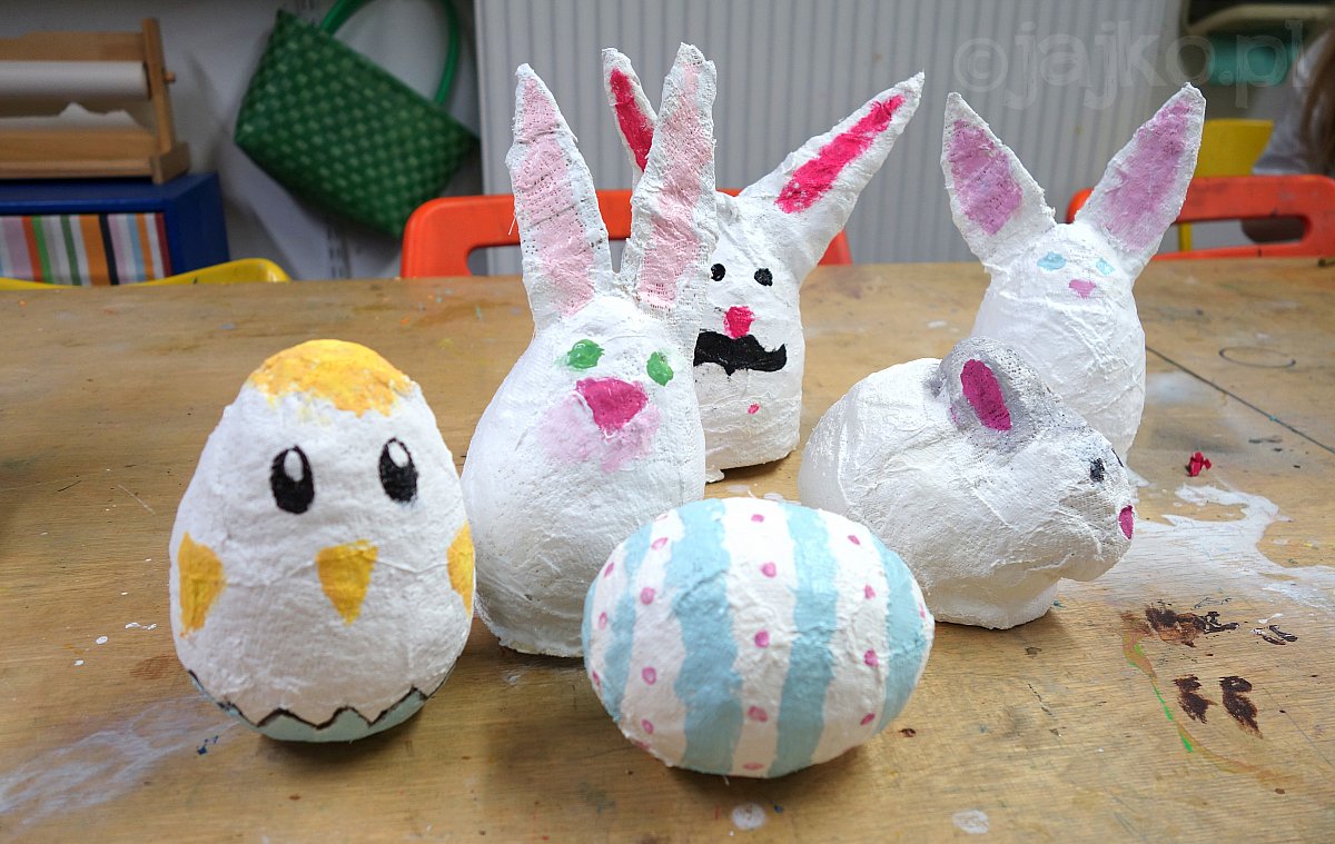 Króliczki, kurczaczki i jajka z bandaży gipsowych, pozłacane wydmuszki,owijane wełną po same uszy baranki i zajączki, filcowe wazonik z fiolek, malowane świąteczne kartki, styropianowe pisanki i zawieszki z plastikowych kółek - takie oto cuda powstały w Jajku z okazji Wielkanocy.