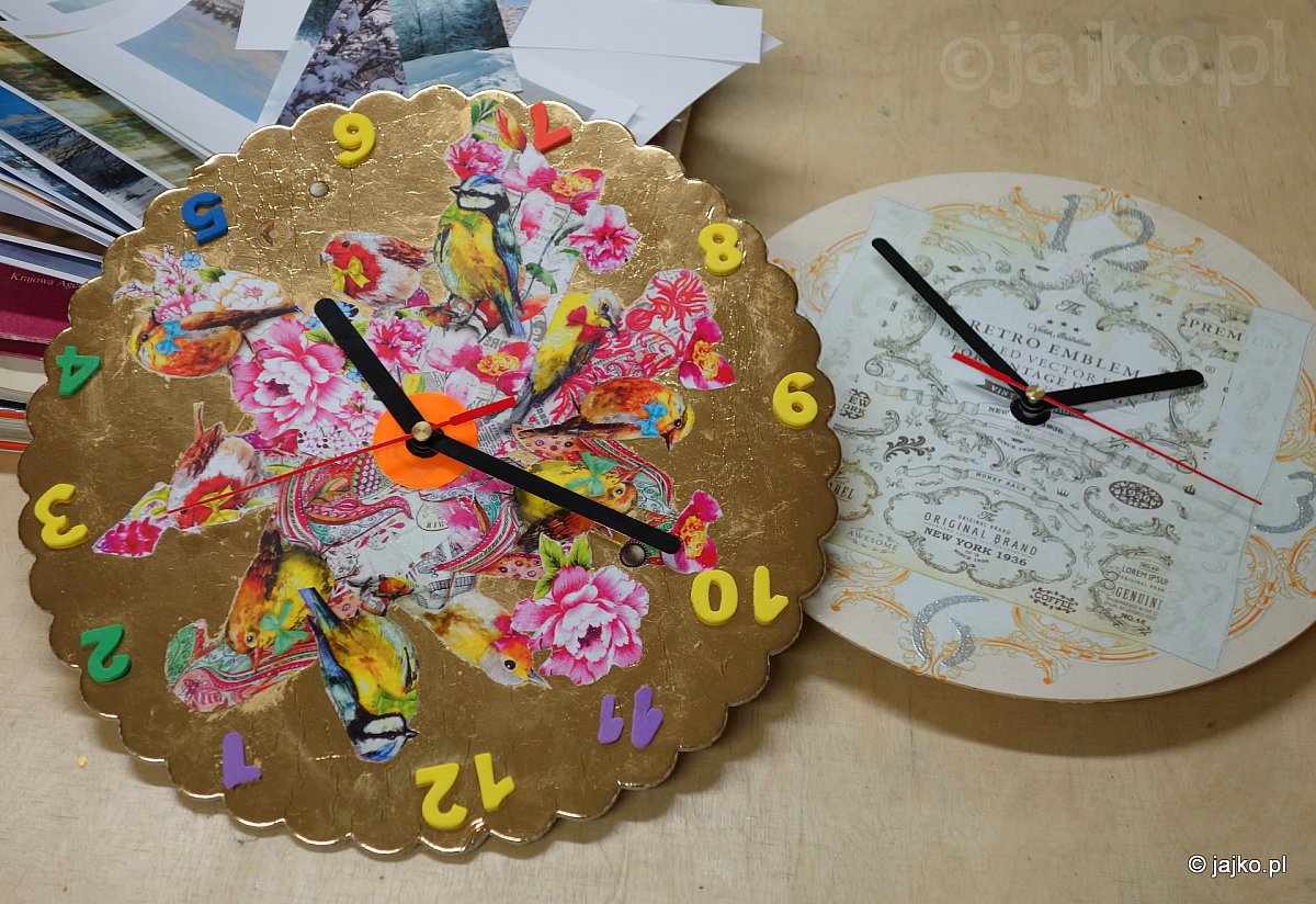 Na przełomie starego i nowego roku robiliśmy zegary. Ich tarcze wypełniły ptaki, kwiaty i koty, lecące samoloty i kolorowe kompozycje pełne brokatu, przepychu złota i sztrasu. Jednym słowem - każdemu według potrzeb.