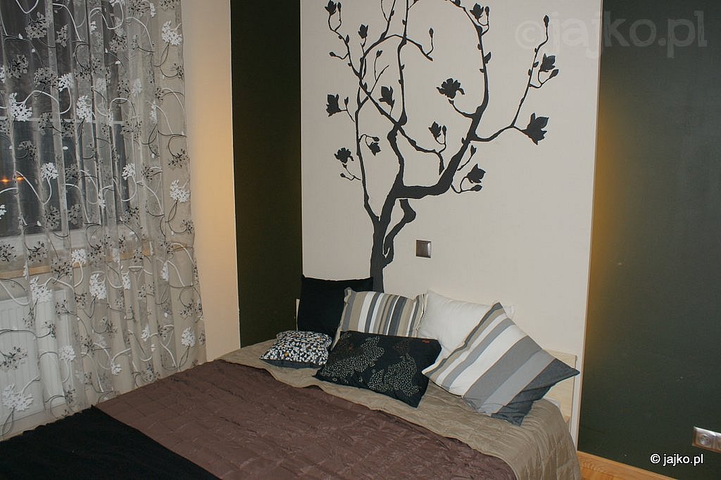 Niedużą, prywatną część mieszkania oddziela jak śluza nieduży przedpokój pomalowany na kolor gorzkiej czekolady. Z niego czworo drzwi prowadzi kolejno do garderoby, łazienki, sypialni właścicieli oraz pokoju córki. Dzięki wydzieleniu miejsca do przechowywania niewielkie sypialnie nie zostały zdominowane przez wielkie szafy a ich oszczędne umeblowanie pozostawia wystarczającą przestrzeń do funkcjonowania.