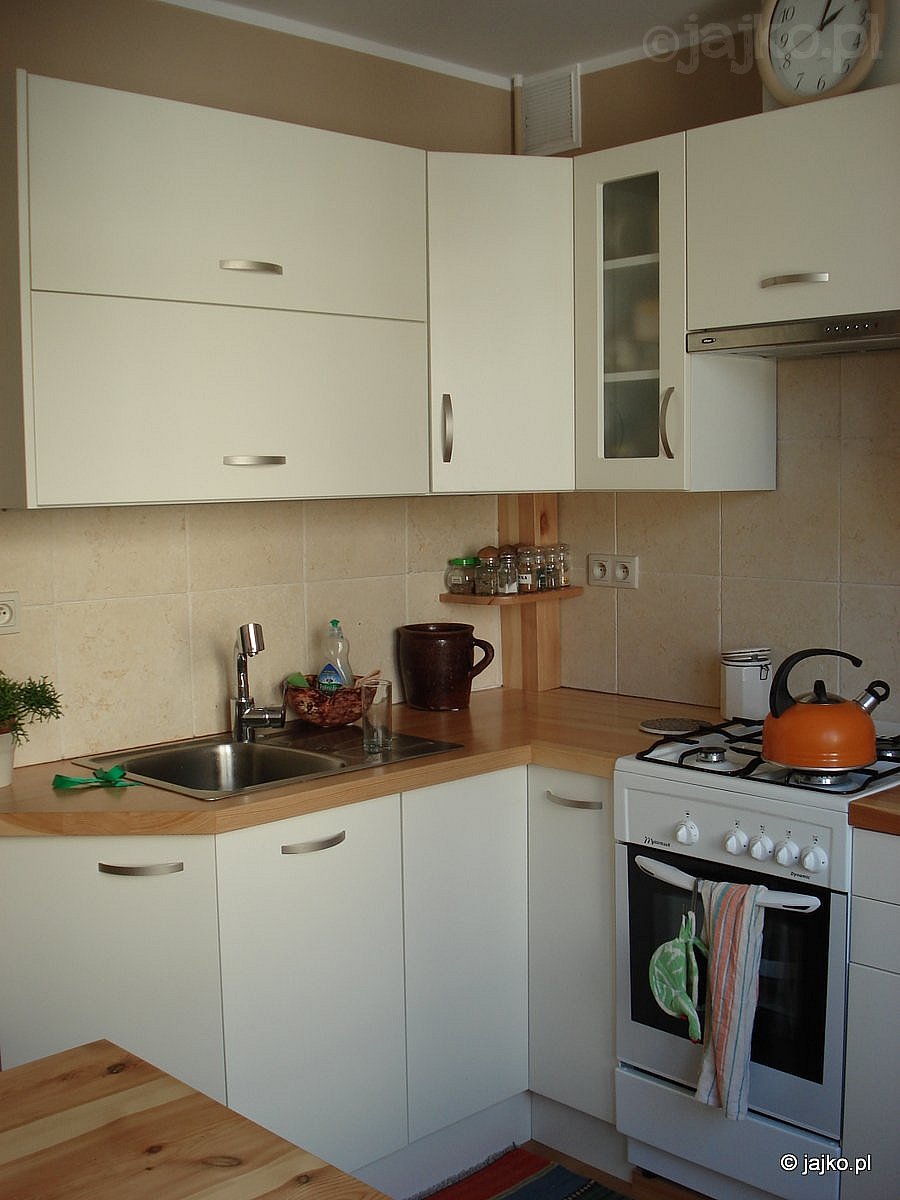 Szafki o prostych frontach powstały na zamówienie (Wójcik i syn). Ich jasny odcień sprawił że stara lodówka i nowa wolnostojąca kuchenka zlały sie z całością zabudowy. Mimo że rozklad kuchni nie pozwolił na duże zmiany, dzięki ustawieniu szafek w L udało się zmieścić ich więcej. Zlew umieszczony na sąsiedniej ścianie poprawił ergonomię ciągu kuchennego. Kilka prostych rozwiązań znacznie ułatwia życie: pod szufladami zmieściła się kompaktowa zmywarka, w szafce nad kuchenką okap, w wiszącej narożnej karuzela, w dziwnym uskoku za lodówką płytka szafka idealna na spiżarkę, a kończąca ciąg kuchenny ścięta szafka mieści wygodne cargo.
