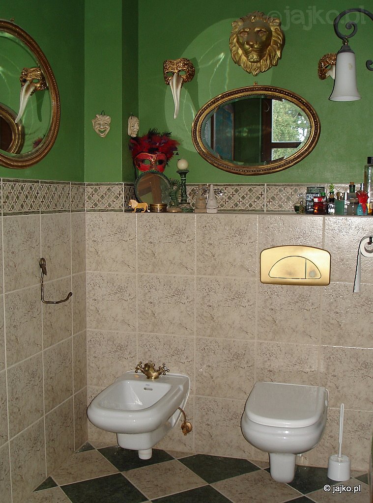 Teatralną, barokową atmosferę podtrzymuje wolnostojąca wanna na lwich nogach i umywalka retro na nodze – kolumnie. Niemniej ważne są stylizowane dodatki – kute lampy, meble rodem z sypialni, konsolki, mosiężne uchwyty, gipsowe odlewy, wazy i oczywiście piękna panorama Wenecji na ścianie naprzeciwko wanny.