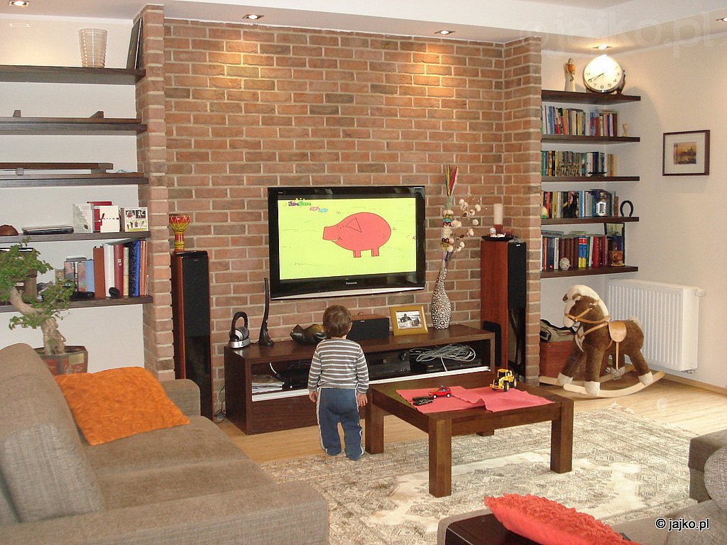 Przestrzeń dzienną wraz z holem i małą łazienką łączy spokojna, ciepła kolorystyka w barwach ziemi - poczynając od kremowych gresów (Opoczno), poprzez beżowe ściany, brązowe kanapy (Noti) orzechowe meble aż po czekoladową ścianę i palisandrowe szafki kuchenne. Niewątpliwą dominantę wnętrza stanowią ceglane ściany - w salonie, oraz oddzielająca kuchnię od przedpokoju.Ważną rolę spełnia również światło - wyeliminowano sufitowe zwisy zastępując je rozproszonym światłem kinkietów oraz dyskretnymi reflektorkami zamontowanymi w podwieszanych sufitach i gzymsach. Wykorzystano również jako światło nastrojowe węże LED w cokołach szafek i za olbrzymim lustrem w korytarzu.