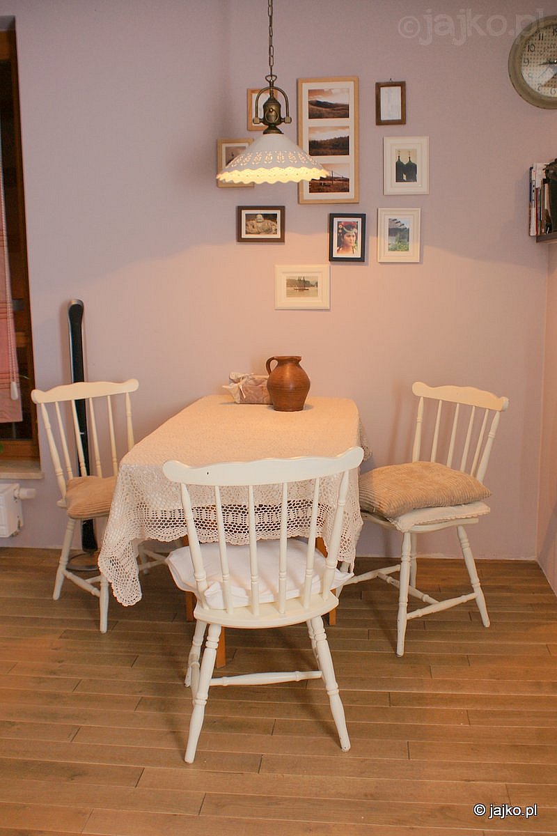 Rustykalny charakter kuchni podkreślają dodatki takie jak  stare żelazka na okapie, koszyczki i pojemniczk wyeksponowane na odkrytych półkach i w przeszklonych szafkach. Podobny charakter utrzymuje położona obok jadalnia z białymi krzesłami typu Windsor, koronkowym obrusem i jakby wydzierganym kloszem zawieszonej nisko lampy.