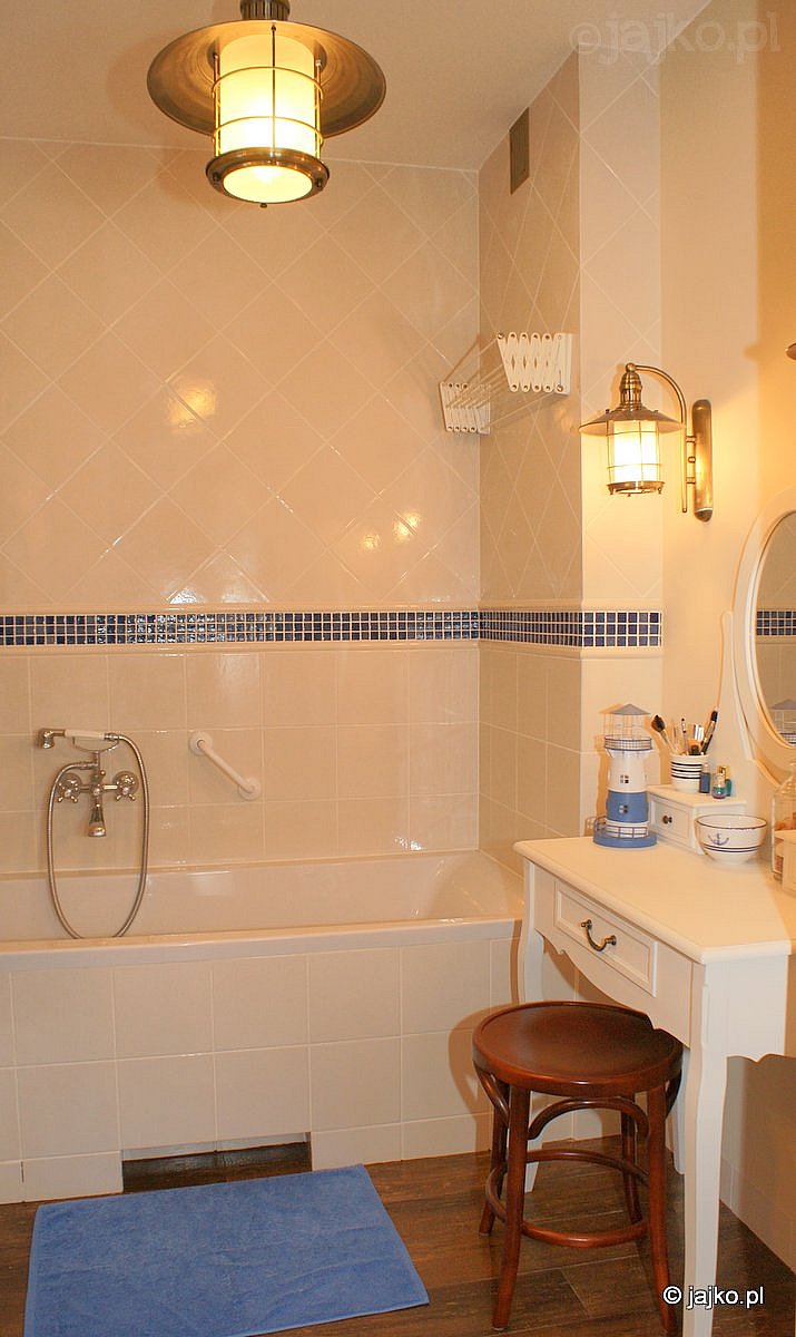 Uzyskano go przy użyciu bardzo prostych materiałów. Na ścianach wykorzystano białe płytki w nieco zapomnianym rozmiarze20x20. Na wysokości 120cm łazienkę obiega podwójny pas z białych wypukłych listew wypełniony w środku niebieską mozaiką ( wszystkie płytki Leroy Merlin). Powyżej w części nad wanną ułożono ponownie białe płytki, ale tutaj w karo. Pozostałe, nie narażone na działalność prysznica ściany pokryto farbą w odcieniu piasku ( Fluger). Podłogę pokrywają płytki imitujące drewniane deski. Szczęśliwie wc znajduje się w osobnym pomieszczeniu, a umywalka jest dyskretnie schowana z boku, więc te "brudne" strefy nie zakłócają wrażenia. Białe meble (Allegro i Ikea), liczne obrazki o tematyce morskiej i ciekawe, nieco "okrętowe" lampy (Leroy Merlin) dopełniają wrażenia raczej saloniku niż łazienki.