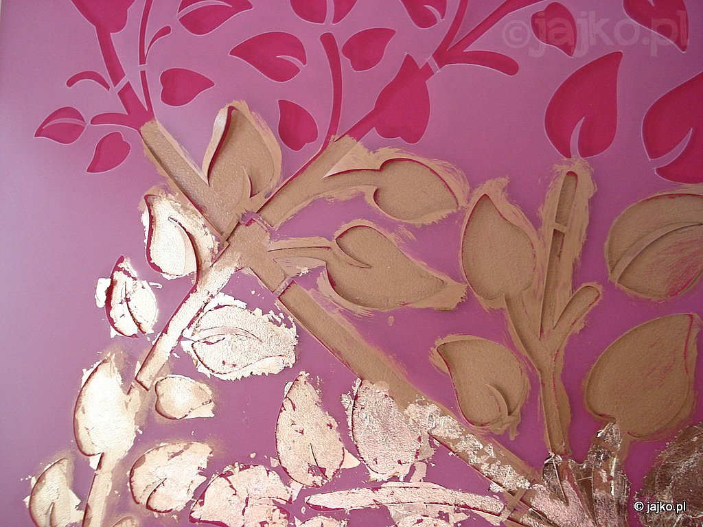 W urządzonym już mieszkaniu właścicielka pragnęła dodać kilka interesujących detali. Zależało jej zwłaszcza na interesującym akcencie w sypialni. Ostatecznie na bordowej ścianie za łóżkiem wyrosło złote drzewo. Na bazie zamówionego (www.szabloneria.pl) szablonu naniesiono ciemno złoty podkład, a po wyschnięciu na niego przyklejono delikatne płatki szlagmetalu. Całość pokryta matowym lakierem stanowi silny kontrapunkt na tle nasyconej barwy ścian.