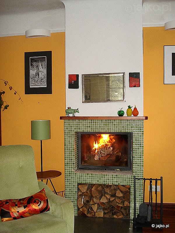 Konstrukcja wykonano w dolnej, nośnej części z cegły, górną część okapową zaś z płyty gipsowo-kartonowej. Front dolnej części dookoła paleniska oraz obszerna wnęka na drewno została obłożona drobną, szklaną mozaiką w odcieniach jasnej zieleni, nawiązującą do kolorystyki tapicerowanych mebli w pokoju. Blacha w kolorze srebrnym zabezpiecza drewniany parkiet na podłodze, do którego kolorystyki nawiązuje płytka drewniana półka na bibeloty umieszczona paleniskiem, przełamująca surowy charakter kominka. Prosty okap poprowadzono aż do sufitu aby poprawić jego proporcje w stosunku do dużego pokoju. Pomarańczowa ściana za kominkiem doskonale podkreśla jego smukłość czyniąc z niego prawdziwe centrum pokoju.