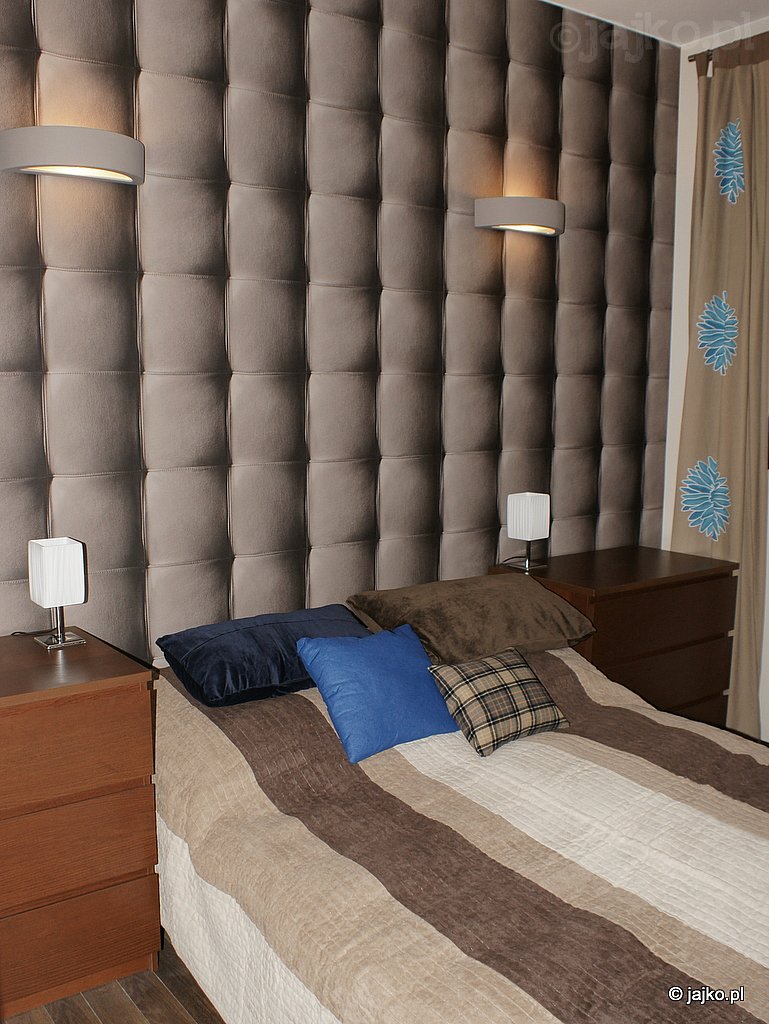 Sypialnię oddzielono od reszty mieszkania ścianką. Dostęp do łóżka zaprojektowano nietypowo, bo przez dwa przejścia - do każdego boku łóżka osobno. Ściana za łóżkiem widoczna niemal z każdego punktu apartamentu, dzięki pokryciu ją efektowną tapetą w deseń tapicerki skórzanej jest zdecydowana dominantą lokalu (Grandeco Skin). Tę samą tapetę zastosowano na ścianie wejściowej akcentując obszar przedpokoju w kontraście z jasnymi płytami gresu którymi wyłożono tę część mieszkania.