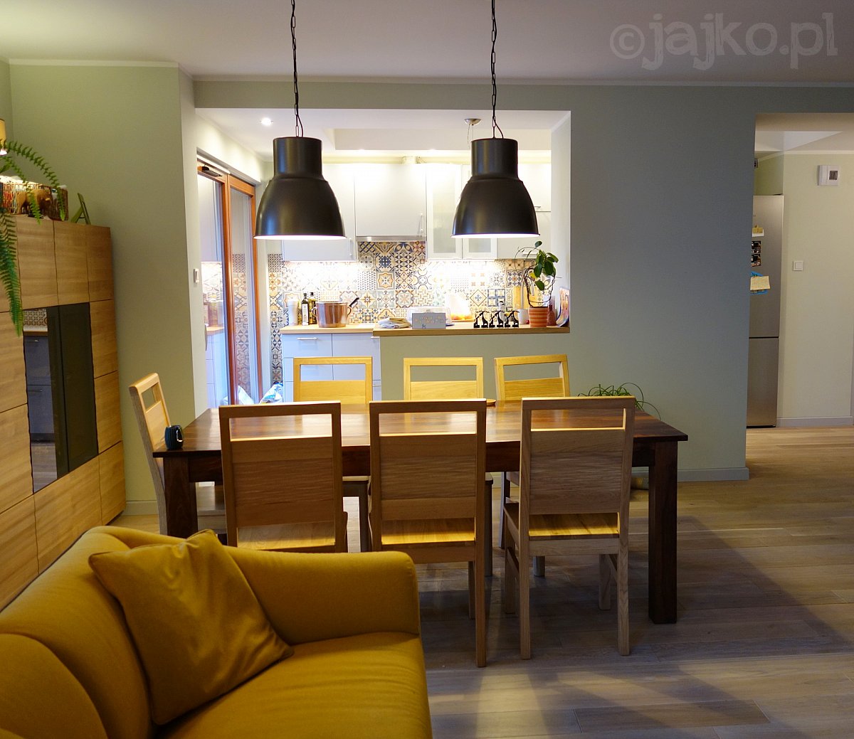 Charakter zapewniły wzory. Jest ich sporo, ale dzięki połączeniu ze stonowanymi formami i kolorami mebli udało się uniknąć krzykliwej pstrokacizny.W salonie najważniejsza jest tapeta ("Just like it" Ugepa) w strefie muzycznej. Przedstawione na niej półki zastawione zbiorami ekscentrycznych przedmiotów stwarzają zaciszną atmosferę gabinetu kolekcjonera.Podkreśla ją stojąca obok solidna mahoniowa biblioteka z drabinką. Żółte kanapy wprowadzają niezbędną plamę koloru, a ich lekka forma nie przytłacza pokoju.