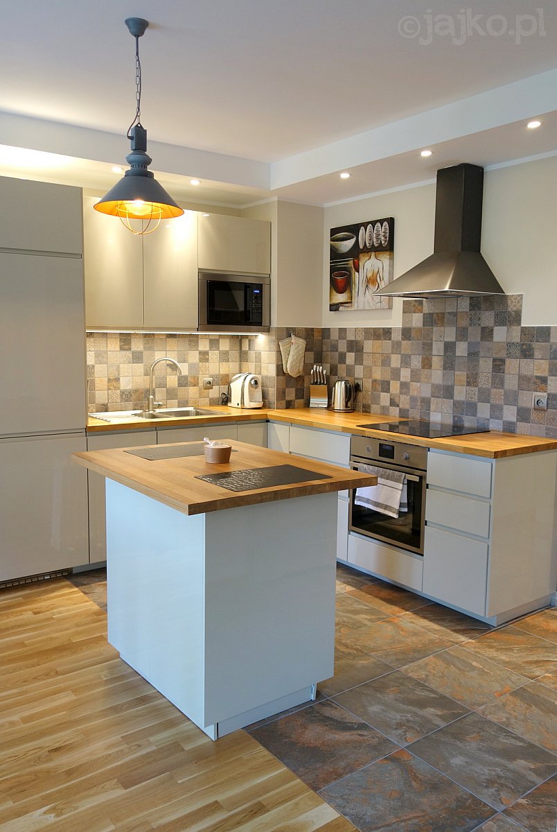 Malutkie wnętrze pełniące funkcję jadalni, kuchni i salonu zostało urządzone w stonowanych kolorach ziemi. Jasne ściany i duże płaszczyzny podłogi pokrytej finishparkietem powiększają malutkie wnętrze. Ścianka z ekokominkiem stanowi centrum pokoju i wraz z efektowną tapetą w głębi pokoju tworzy przytulny klimat. W części kuchennej mozaika ścienna i gres podłogowy z imitacji łupka dobrze współgrają z prostymi, popielatymi meblami ocieplonymi drewnianymi blatami. Płytki podłogowe przez kuchnię i korytarz przechodzą płynnie do łazienki co spaja niewielką przestrzeń. Efektowna łukowa kabina walk in z giętego szkla i nieco industrialna indyjska szafka podumywalkowa z drewna mango nadają także temu pomieszczeniu charakteru. Istotny w tym projekcie był czas i koszty, dlatego też większość materiałów wykończeniowych została kupiona w siecówkach budowlanych i meblowych.