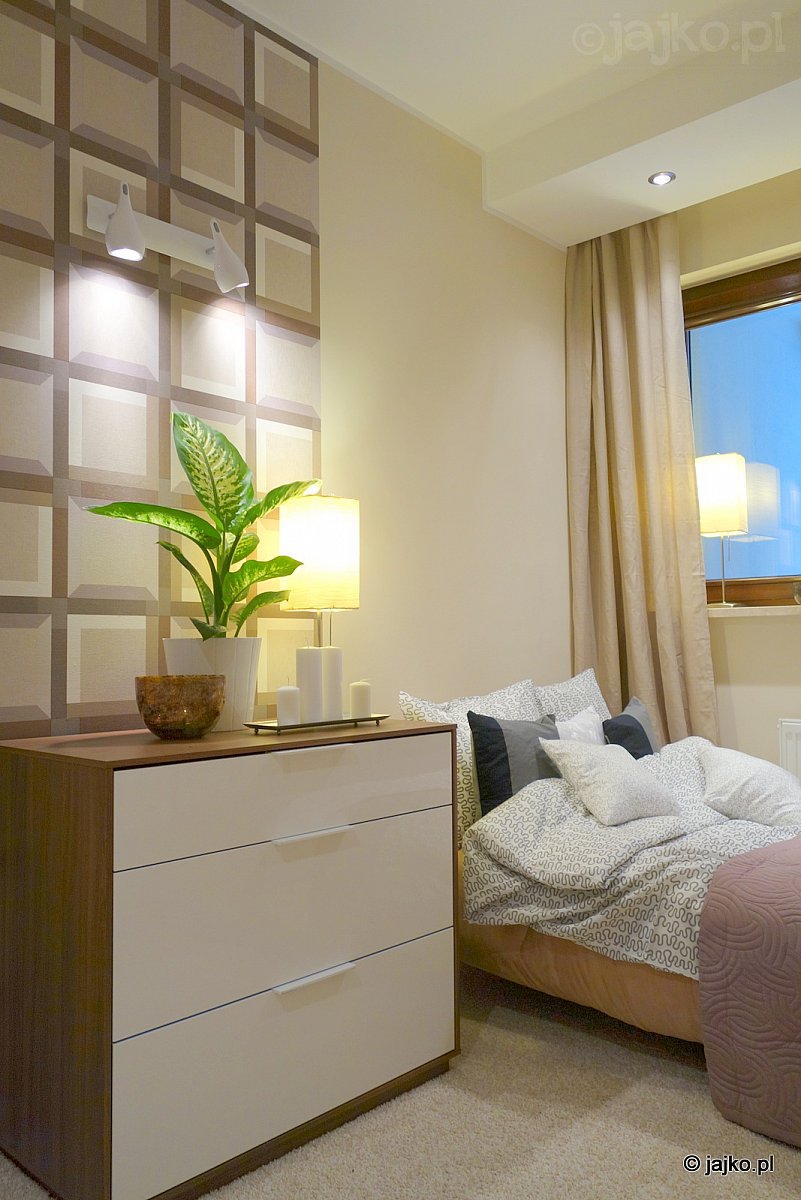 Nieduża kuchnia przerobiona została na sypialnię. Stonowana gama beży, boczne oświetlenie, miękka wykładzina utworzyły enklawę wyciszenia zachęcającą do wypoczynku. Fakturalna tapeta 3D na fragmentach ścian pozwoliła uniknąć monotonii i dodała głębi.